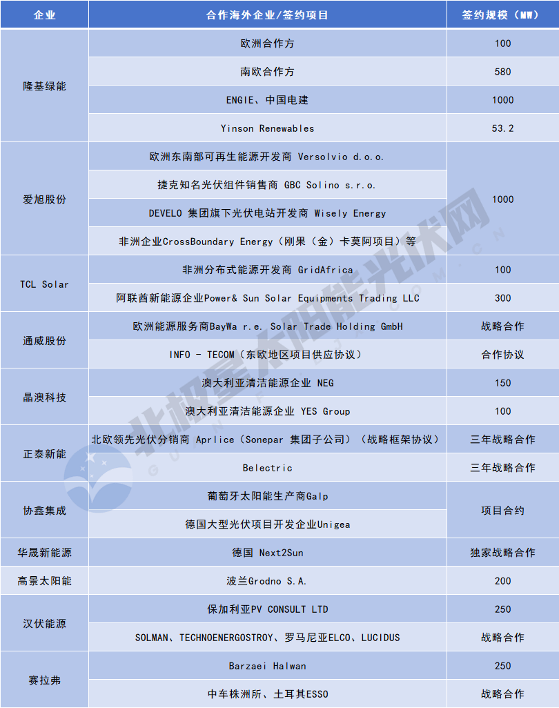 5月以来,隆基绿能、晶澳科技、通威股份、正泰新能、爱旭股份、华晟新能源、协鑫集成、高景太阳能、赛拉弗等11家中国光伏龙头企业,密集签约海外光伏项目。