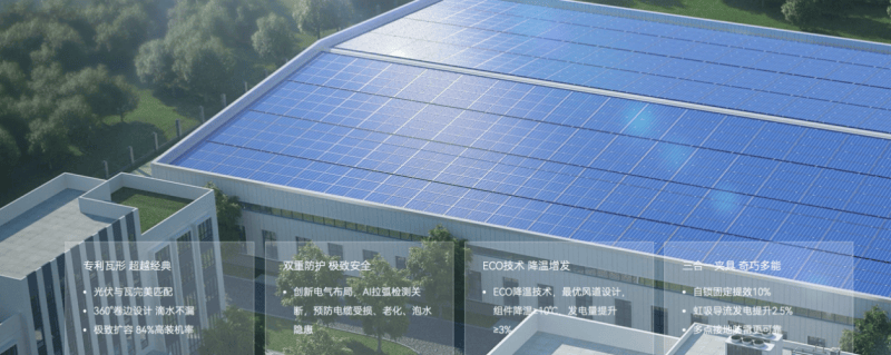 作为BIPV产业链的深度参与者,阳光新能源曾荣获“2022中国十大BIPV品牌”,其最新一代工商业场景“iBuilding阳光顶BIPV”通过专利结构防水技术和360度卷边设计,实现屋顶滴水不漏,彻底解决传统光伏屋顶易渗漏的痛点。同时,创新设计的电气布局与三合一防雷夹具,提供双重主动安全防护,确保系统在极端天气下的稳定性,为企业生产运营提供可靠保障。此外,产品独特的ECO降温技术通过截面优化设计,使气流产生“湍流扰动效应”,组件降温10℃以上,发电量提升3%,进一步优化企业能源收益。