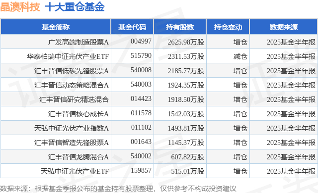 根据2025基金半年报公募基金重仓股数据,重仓该股的公募基金共31家,其中持有数量最多的公募基金为广发基金的广发高端制造股票A。广发高端制造股票A目前规模为44.64亿元,最新净值1.2407(8月14日),较上一交易日下跌1.38%,近一年下跌0.26%。该公募基金现任基金经理为郑澄然。郑澄然在任的基金产品包括:广发鑫享灵活配置混合A,管理时间为2020年5月20日至今,期间收益率为50.75%;广发兴诚混合A,管理时间为2021年1月6日至今,期间收益率为-53.62%;广发诚享混合A,管理时间为2021年2月8日至今,期间收益率为-54.16%。